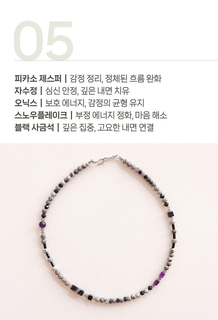 <옵션 5> 오행 파티클-수기운 보충 ✔ 피카소제스퍼 4mm ✔ 자수정(라운드,실린더) ✔오닉스(실린더) ✔스노우플레이크 흑요석(플랫) ✔블랙 사금석(스퀘어) ✔써지컬부자재, 마감