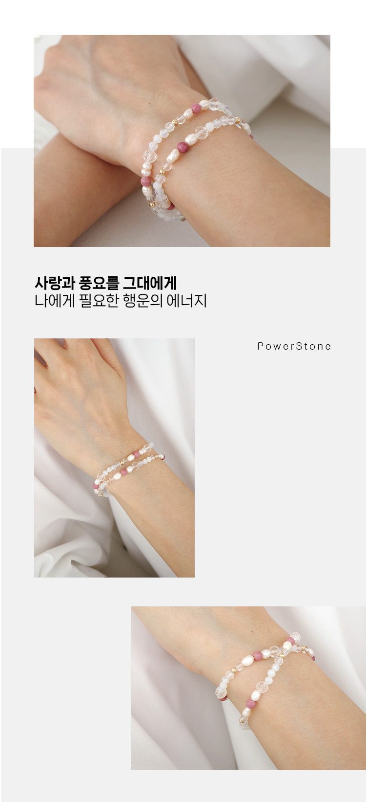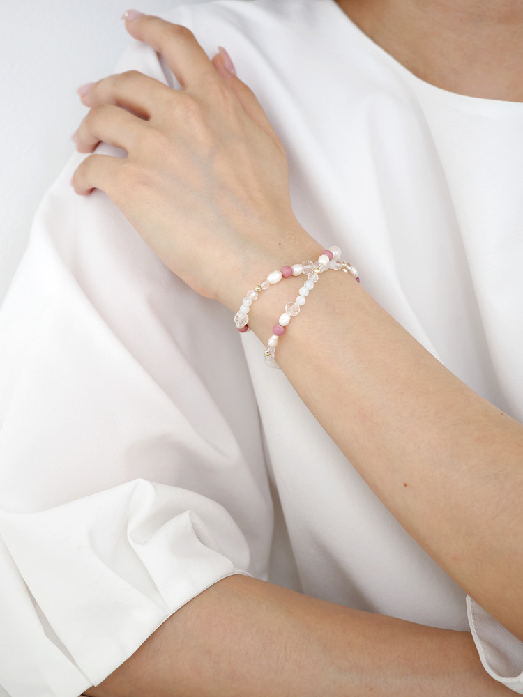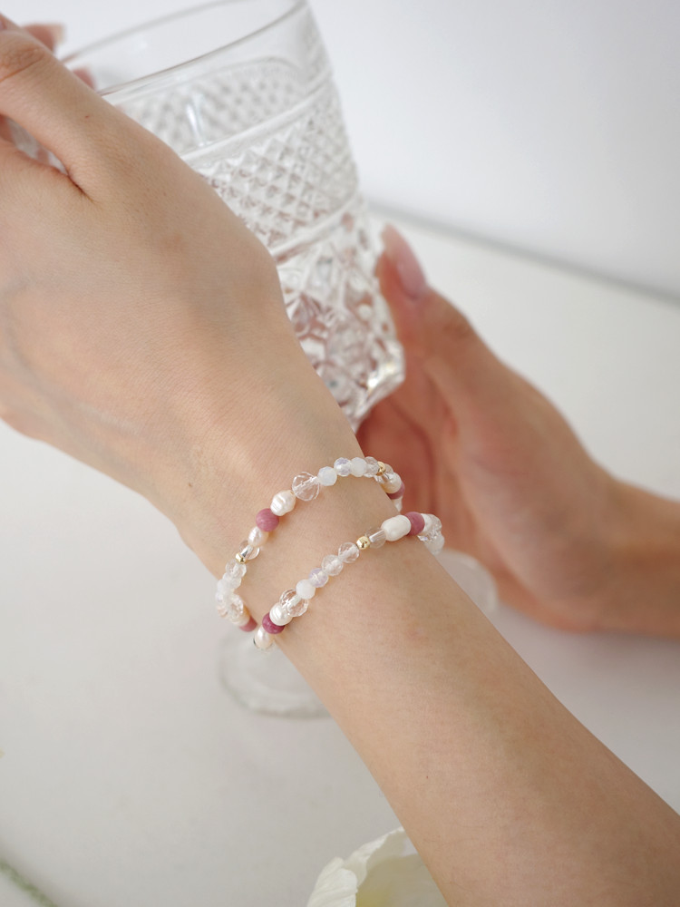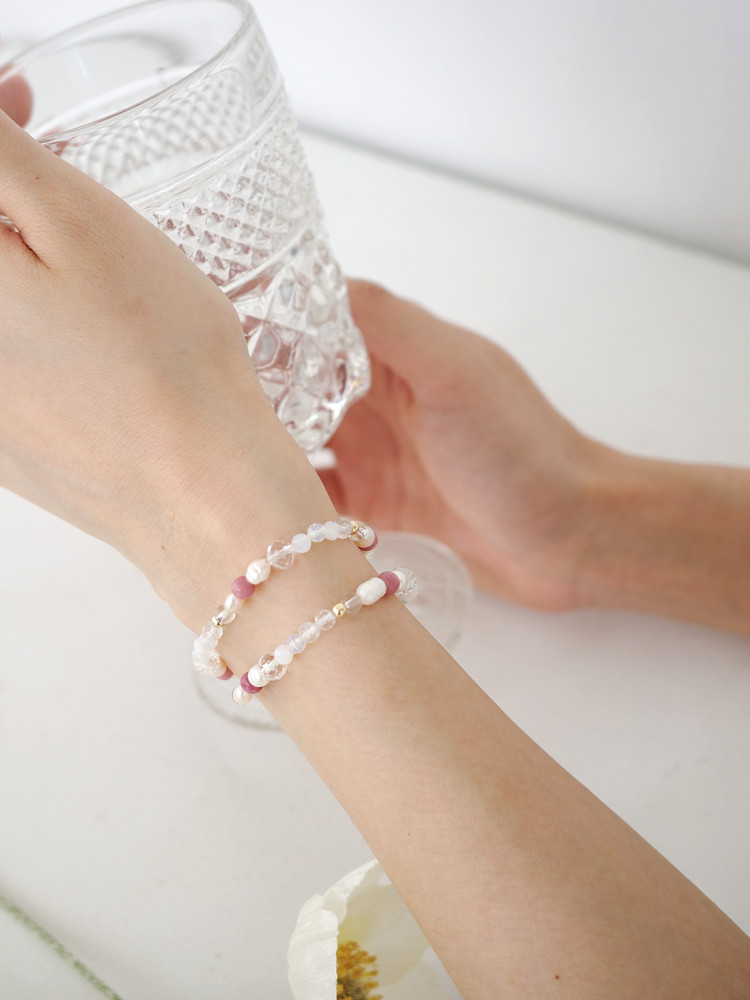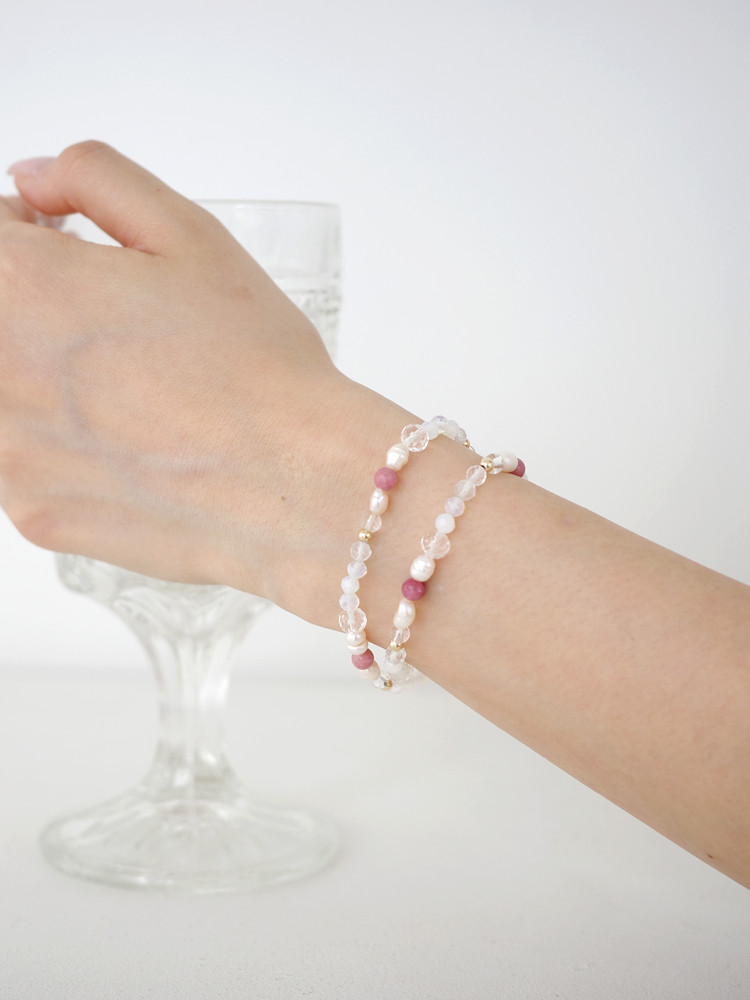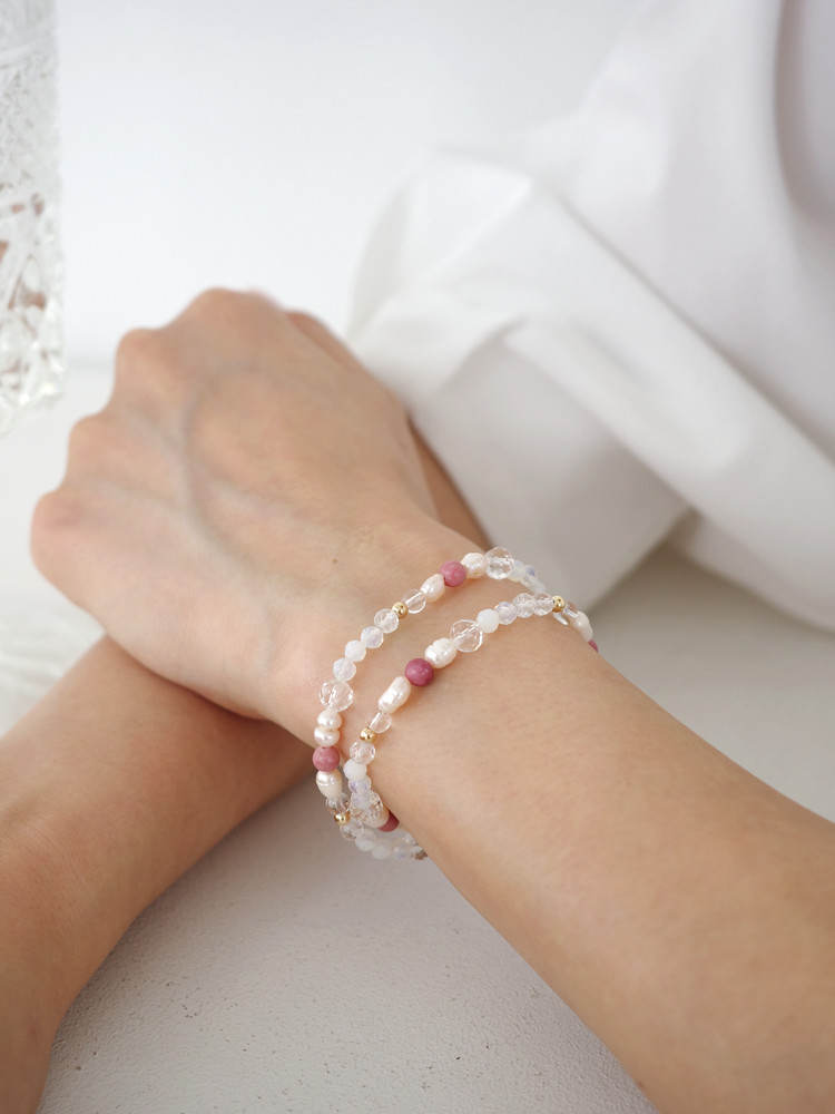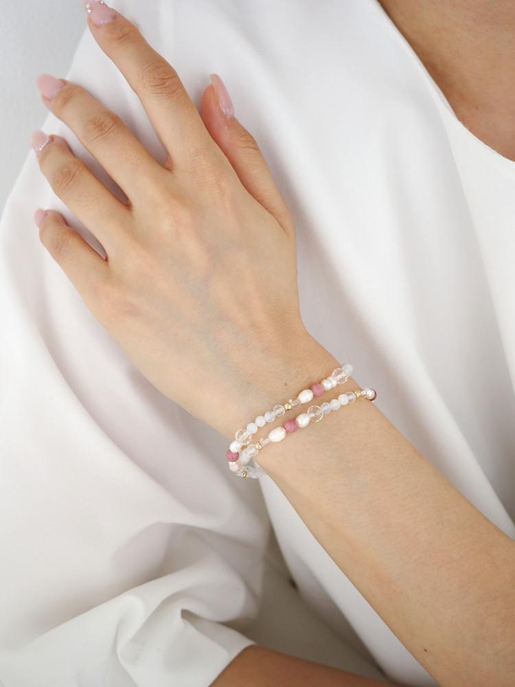 천연 담수 진주 4~5mm(3A) 커팅 문스톤 4mm 백수정 6mm,4mm 로도나이트 4mm 14k 골드필드 3mm [사랑과 풍요의 힘] 진주문 두줄 원석팔찌